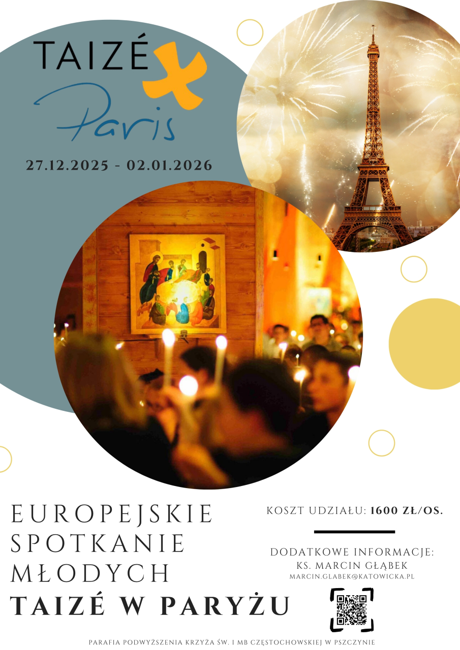 Zapraszamy młodzież do udziału w 48. Europejskim Spotkaniu Młodych w Paryżu, przygotowanym przez ekumeniczną Wspólnotę Taizé. Wyjazd organizowany z Katowic odbędzie się w dniach 27.12.2025-02.01.2026, koszt udziału: 1600 zł/os. (w cenie: noclegi, wyżywienie, ubezpieczenie, przejazd). Kontakt: ks. Marcin Głąbek - marcin.glabek@katowicka.pl.