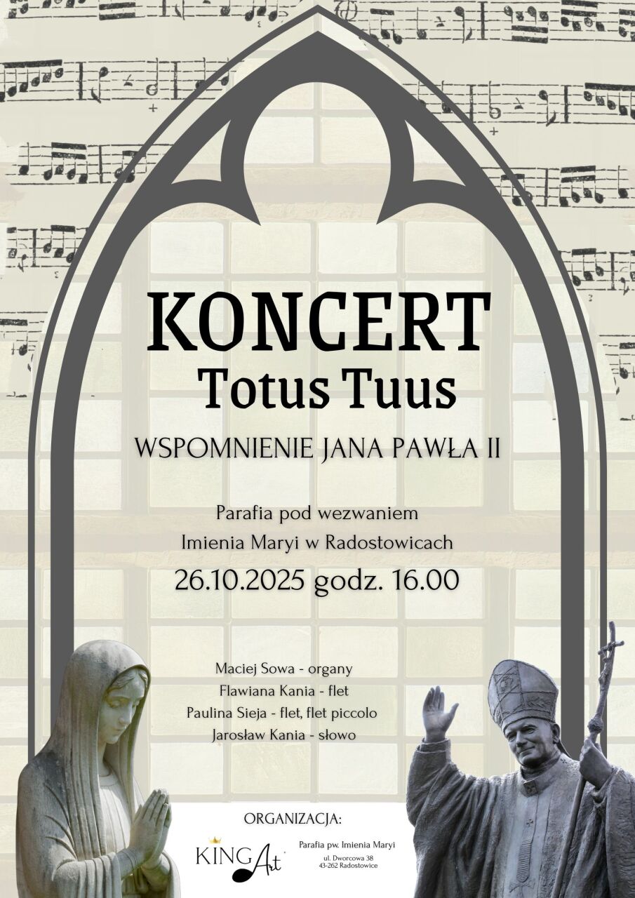 26 października o godzinie 16:00 w Parafii pod wezwaniem Imienia Maryi w Radostowicach odbędzie się koncert upamiętniający św. Jana Pawła II. Będzie to doskonała okazja, by wspomnieć Papieża Polaka w szczególnym roku: 20 rocznicy Jego śmierci i 105 rocznicy urodzin.